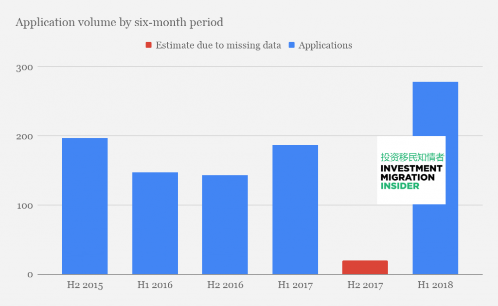 Evidencing the instrumentality of the contribution discount, 94% of applicants in H1 2018 – 261 of 278 – chose the donation route, while only seven and ten applicants opted for real estate and business investment, respectively. By comparison, during the first half of 2017, only 38% of applicants chose the NDF-contribution option. Overall, since 2014, 72% of applications came in under the contribution option.