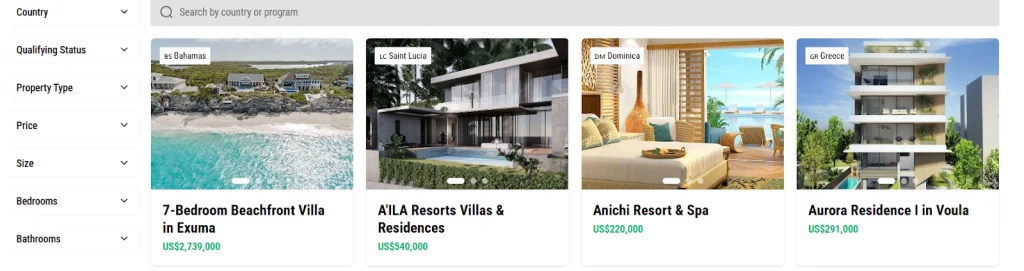 Listings include Greek villas eligible for the Golden Visa and Caribbean developments that qualify applicants for citizenship programs. Investors can filter properties by: