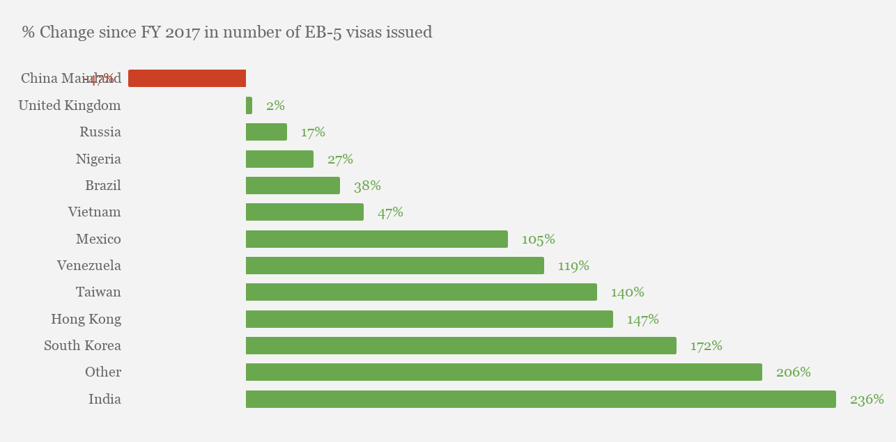 Not since 2008 has the proportion of EB-5 visas going to Chinese-born investors been lower. See the animated graph below for an illustration.