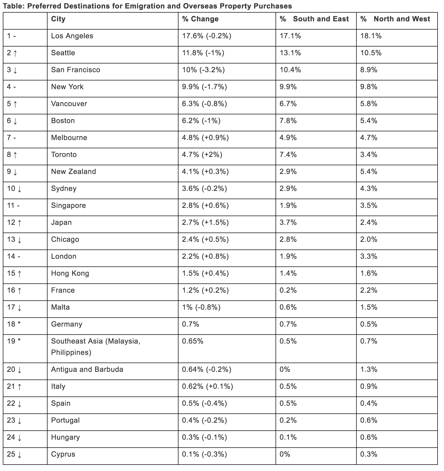 The United States is once again the top destination for investment emigration and property purchasing. Los Angelesremains the most popular city in North America among Chinese HNWI for the fourth year running, while Seattle is on the rise every year, comes ahead of third-placed San Francisco for the first time, in second place. New York remains the fourth most popular city, followed by Vancouver in fifth. Overall, US cities have seen a fall in favor since the Trump Presidency.Overseas property: