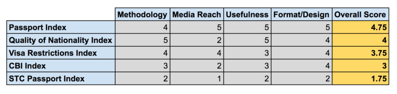 What follows is a ranking of all these indices. I’ve given each index a score of 1-5 on four dimensions – methodology, media reach, usefulness and format/design – and compiled an overall ranking. Let’s call it the 2017 Investment Migration Index Index©. It will undoubtedly be featured in the New York Times and Wall Street Journal any day now.