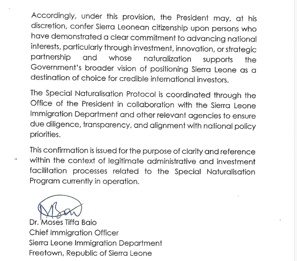 Dr. Moses Tiffa Baio, Chief Immigration Officer, confirmed the program operates under Section 27A of the Sierra Leone Citizenship Act 1973, which grants the President discretionary authority to confer citizenship.