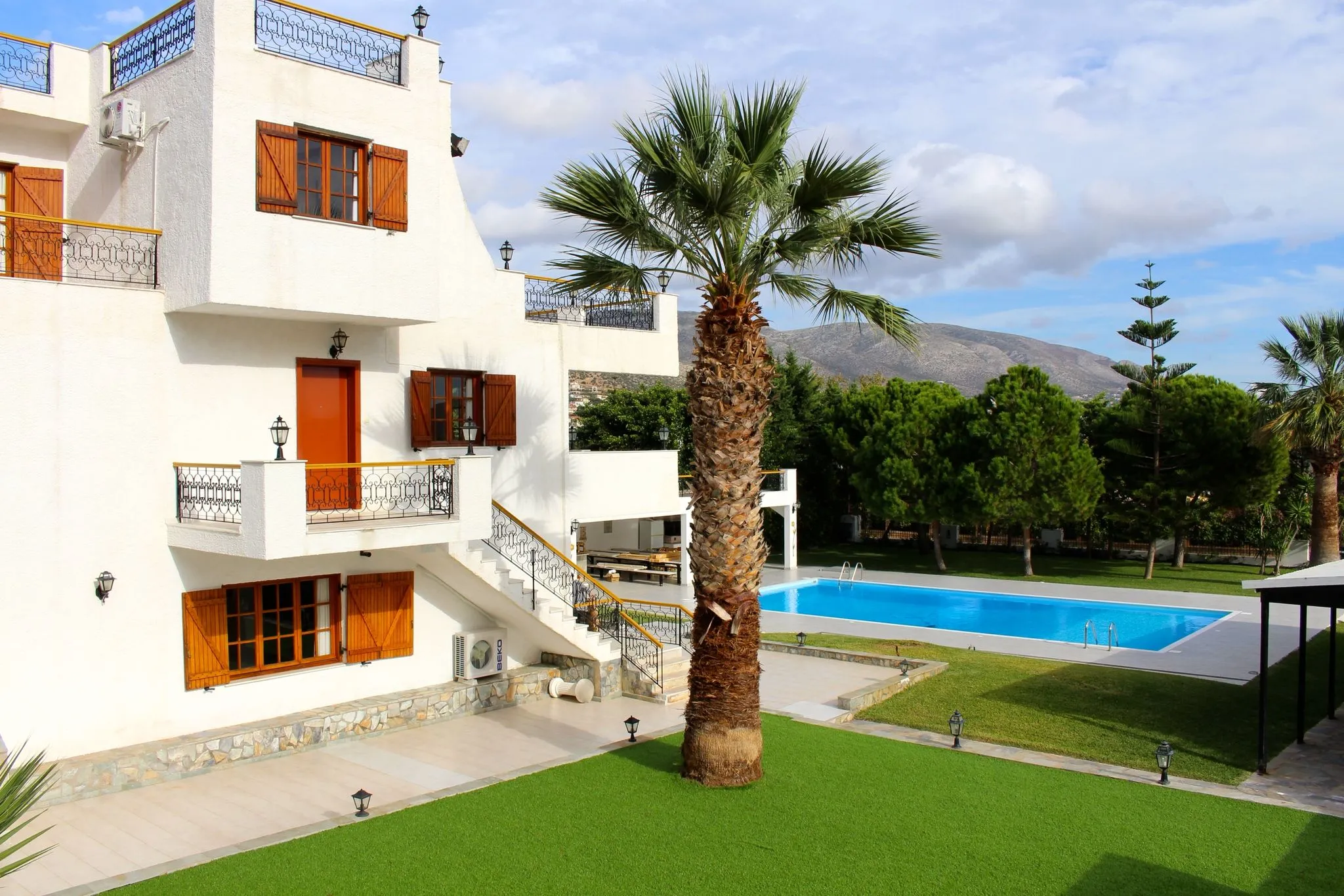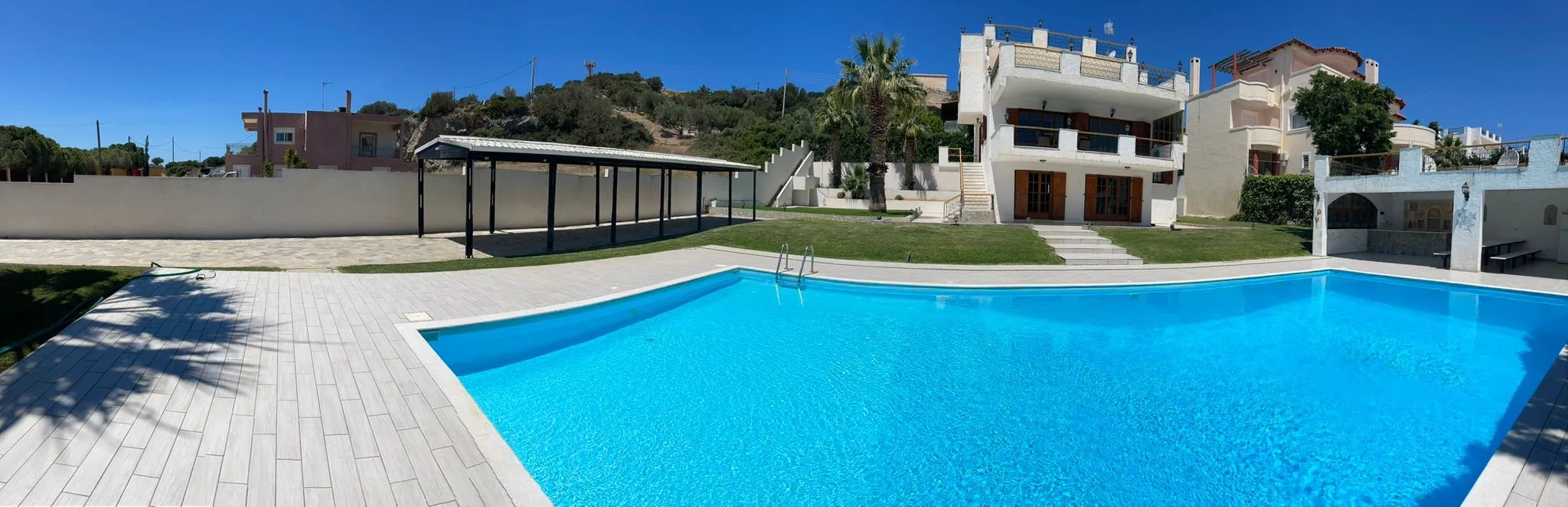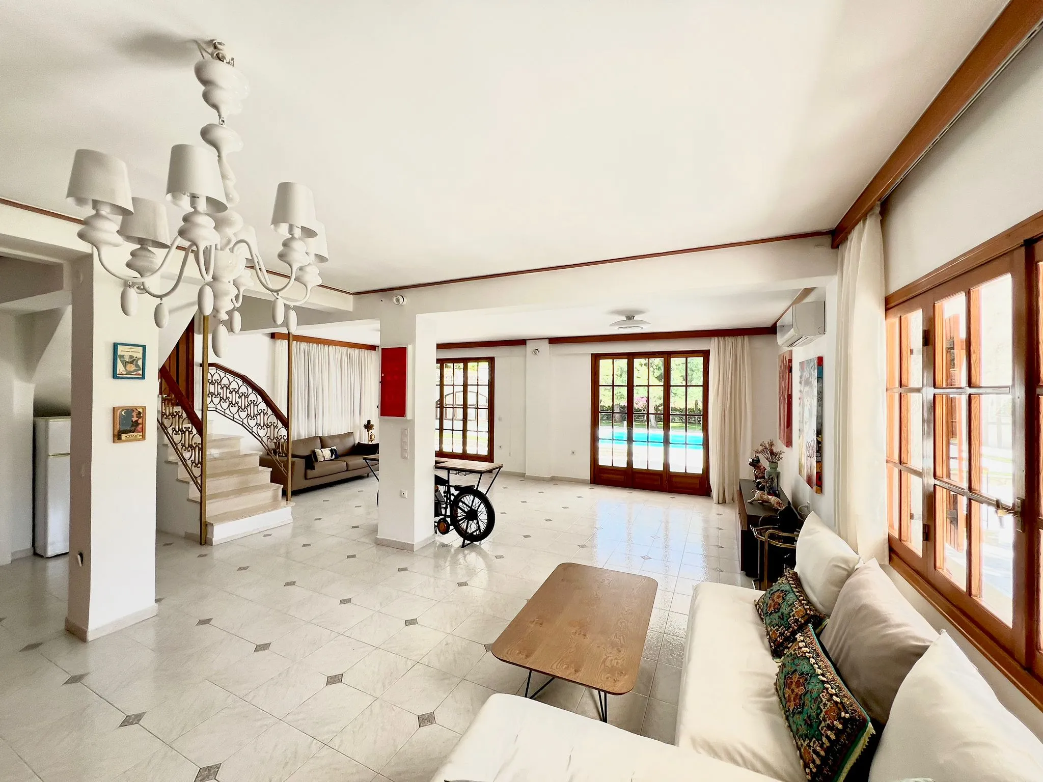 This 264-square-meter Greek estate with a pool and orchard sits on nearly 2,000 square meters of landscaped grounds in Lagonisi, a coastal neighborhood on the Athens Riviera sometimes called the “Greek Malibu.” The property is 800 meters from the Saronic Gulf, 20 minutes from Athens International Airport, and 45 minutes from central Athens.