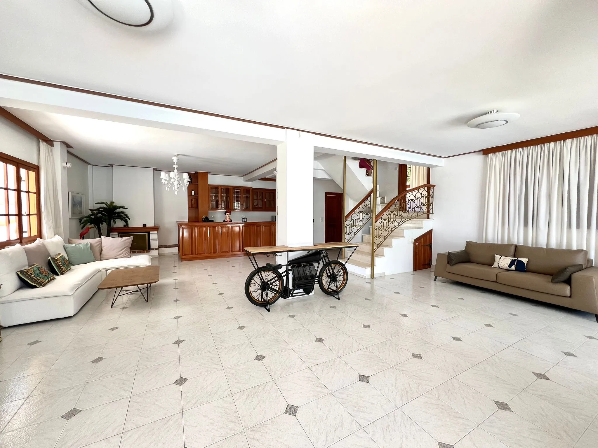 Built in 1990 and renovated in 2015, the home spans three levels with five bedrooms, three bathrooms, two living areas, and two kitchens. Semi-precious onyx stone floors, marble surfaces, and a working fireplace anchor the interiors. The private pool is Olympic depth, uncommon for residential properties.