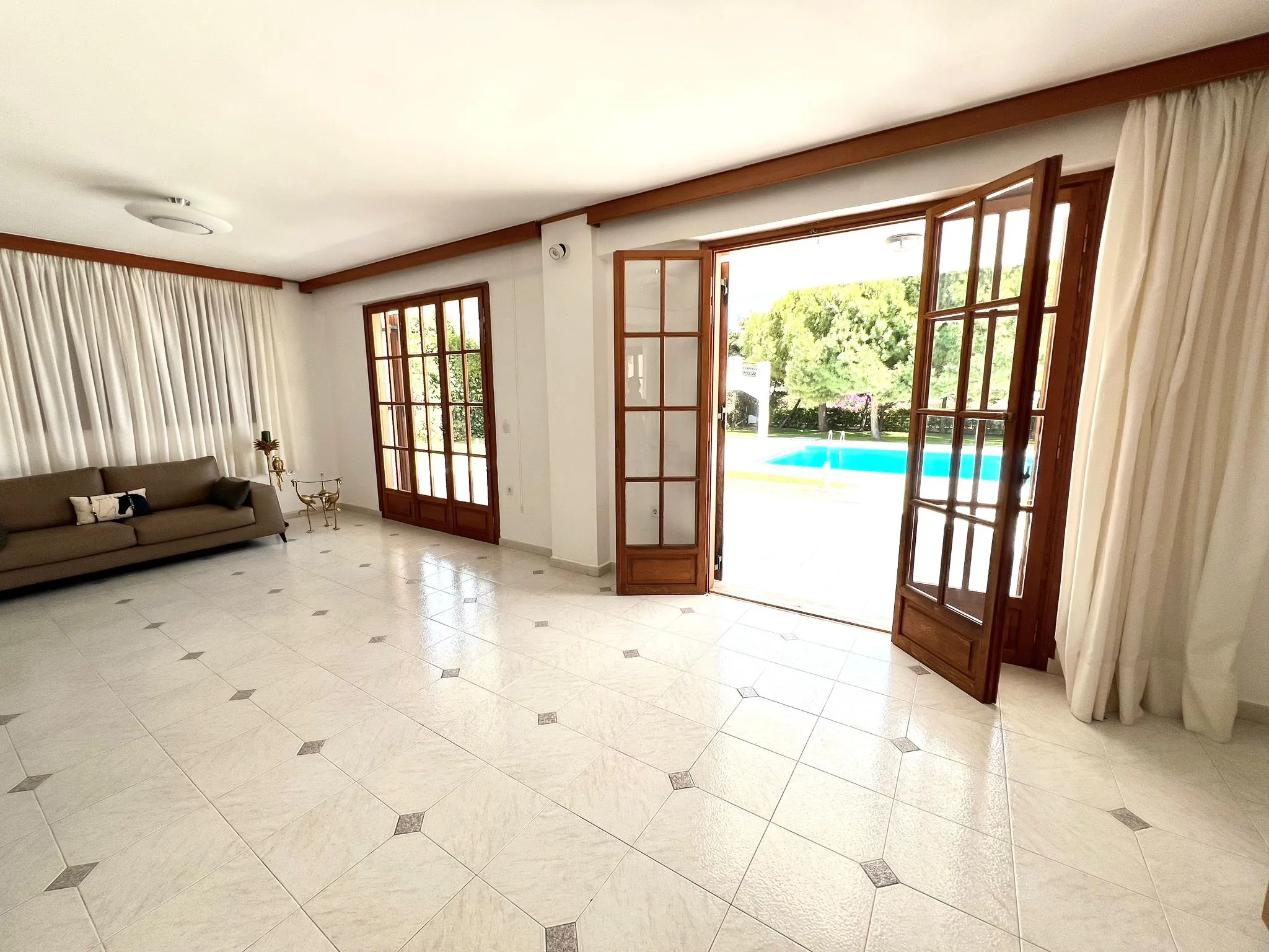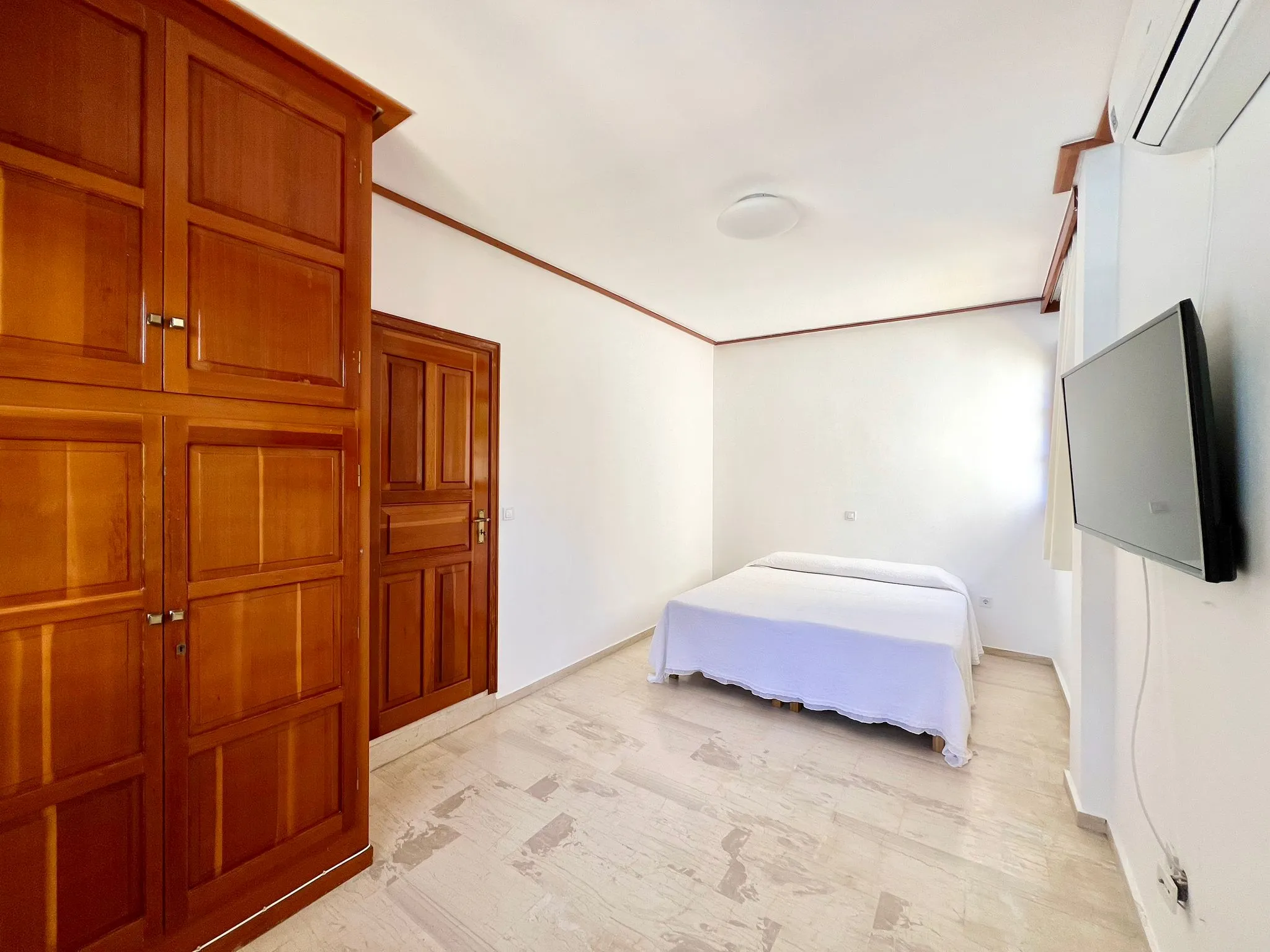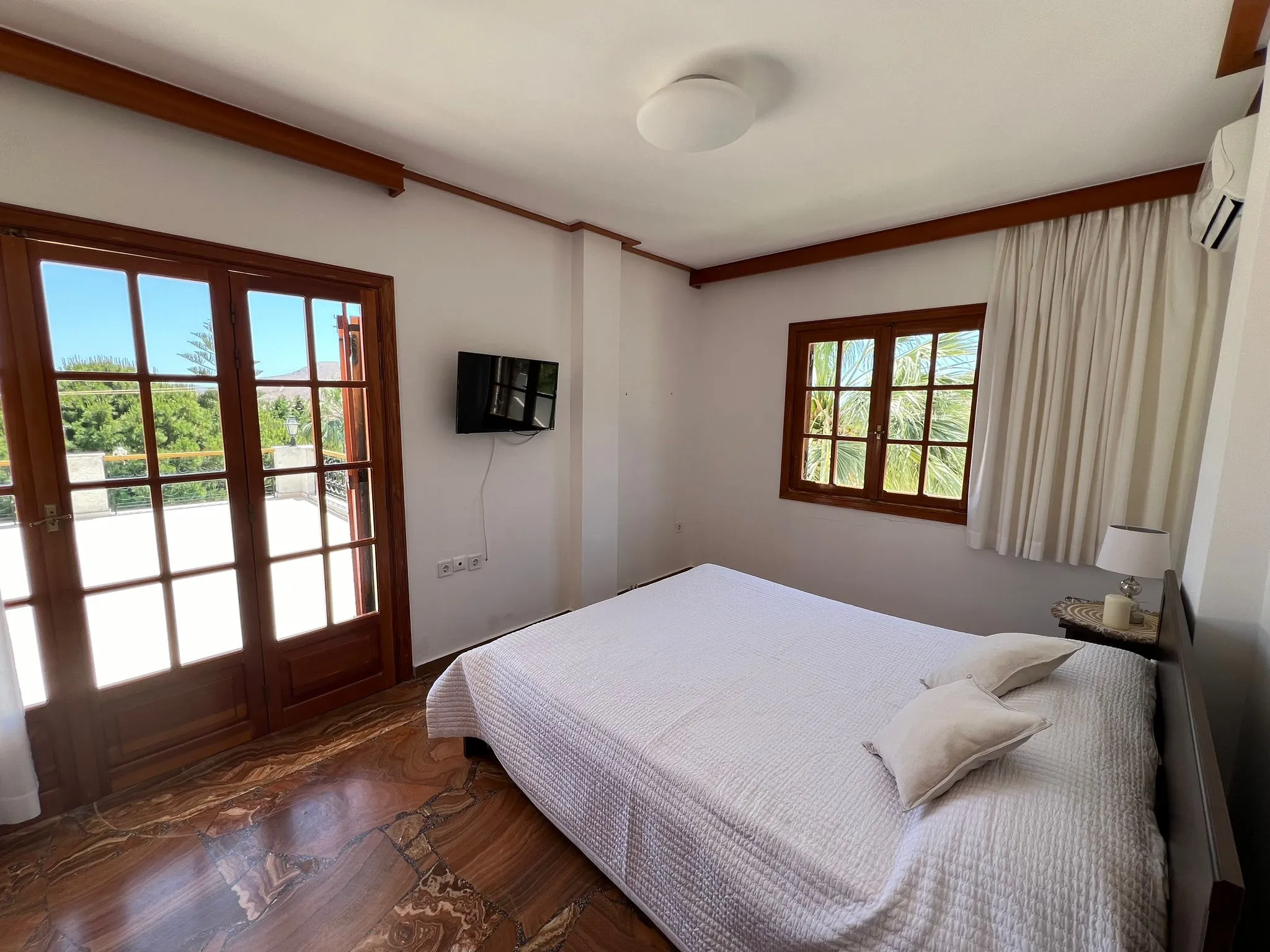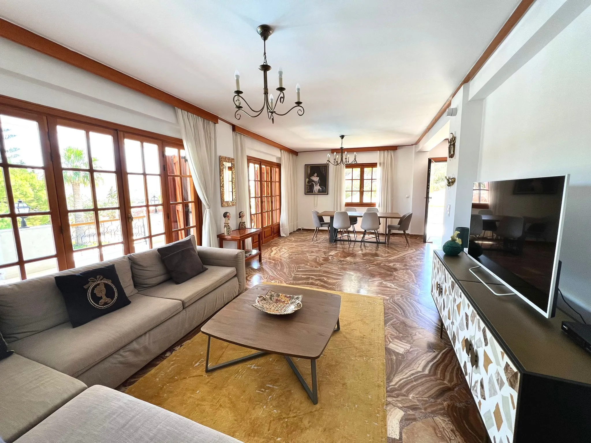 The grounds include lawns, mature palms, cypresses, and pines, plus a working orchard producing lemons, figs, oranges, and olives. The property sits on a quiet cul-de-sac and comes fully furnished with air conditioning, solar water heating, and secure entry. It can generate rental income immediately or serve as a primary residence.