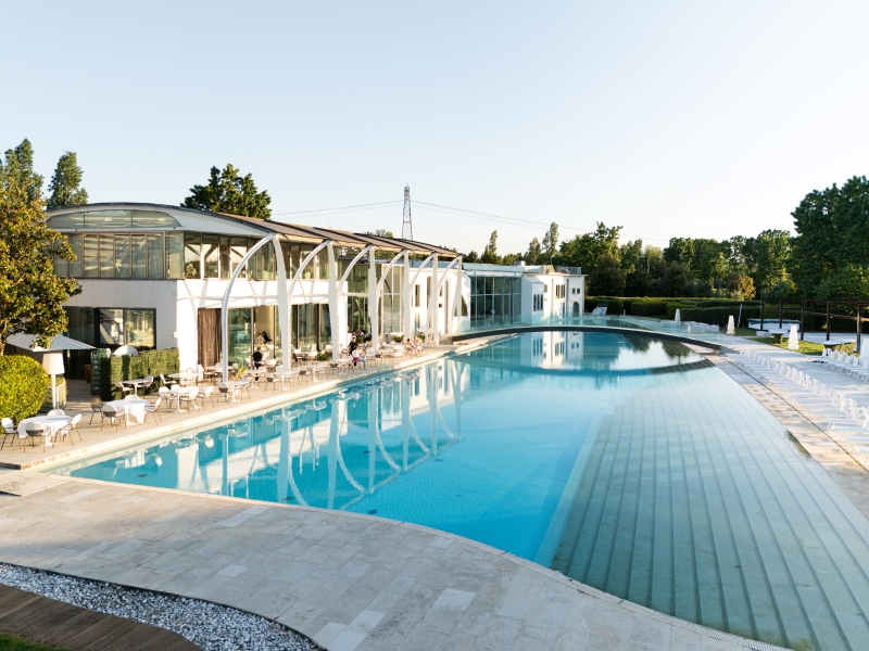 The resort features Italy’s longest white Sicilian-limestone swimming pool, complemented by a comprehensive spa complex including indoor hydrotherapy pools, chromotherapy treatments, Turkish baths, and specialized massage facilities.
