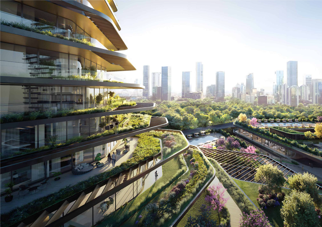 Nearly 100,000 square meters of landscaped greenery and walking trails. Not a single car penetrates the open spaces. Just paths and oxygen and the kind of silence that costs exponentially more with every meter you get closer to a major city center.
