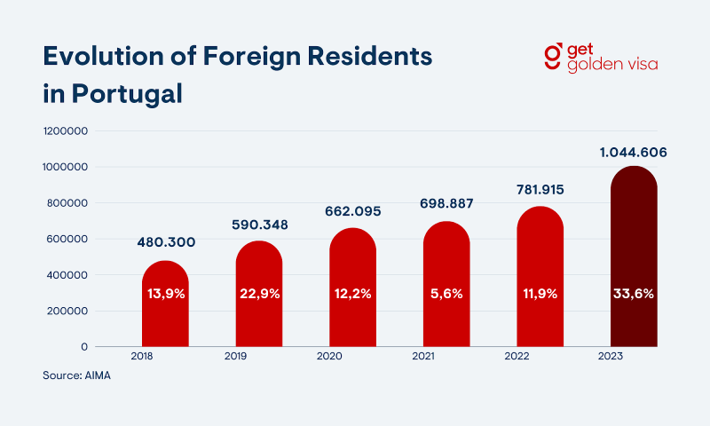 There has been an incredible increase in the number of foreign residents in Portugal, growing by 34% and reaching a record high of 1,044,606. This reflects a phenomenal 117% increase from 2018, when the expat population of Portugal was at 480,300.